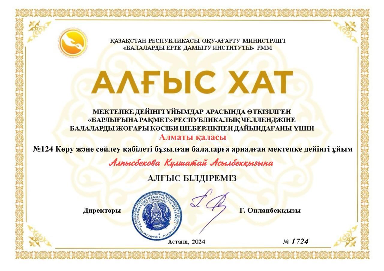 "Барлығына рақмет" республикалық челлендж » ГУ "Специальный (коррекционный) ясли сад №124 для детей с нарушениями зрения"