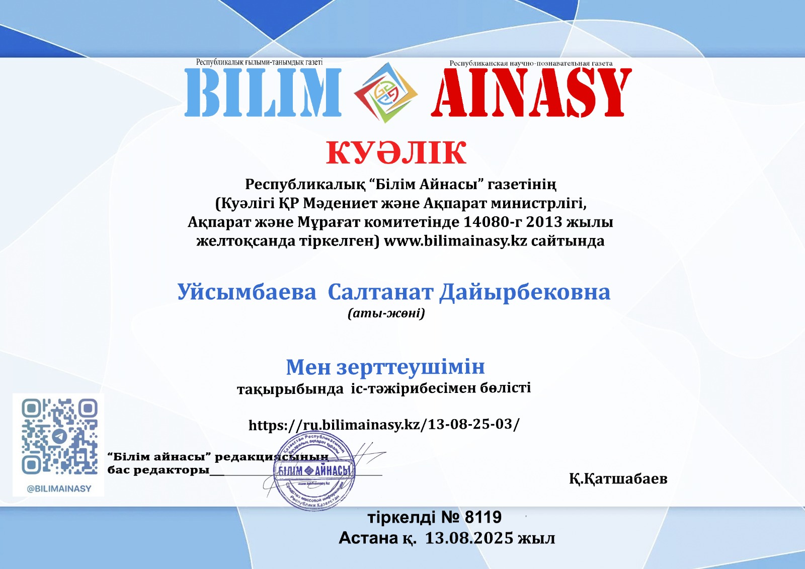 15 тамыз 2025 0 1 2 3 4 5 "Мен зерттеушімін" халықаралық тағылымдама нәтижелері бойынша білім беру жобасы жобасы