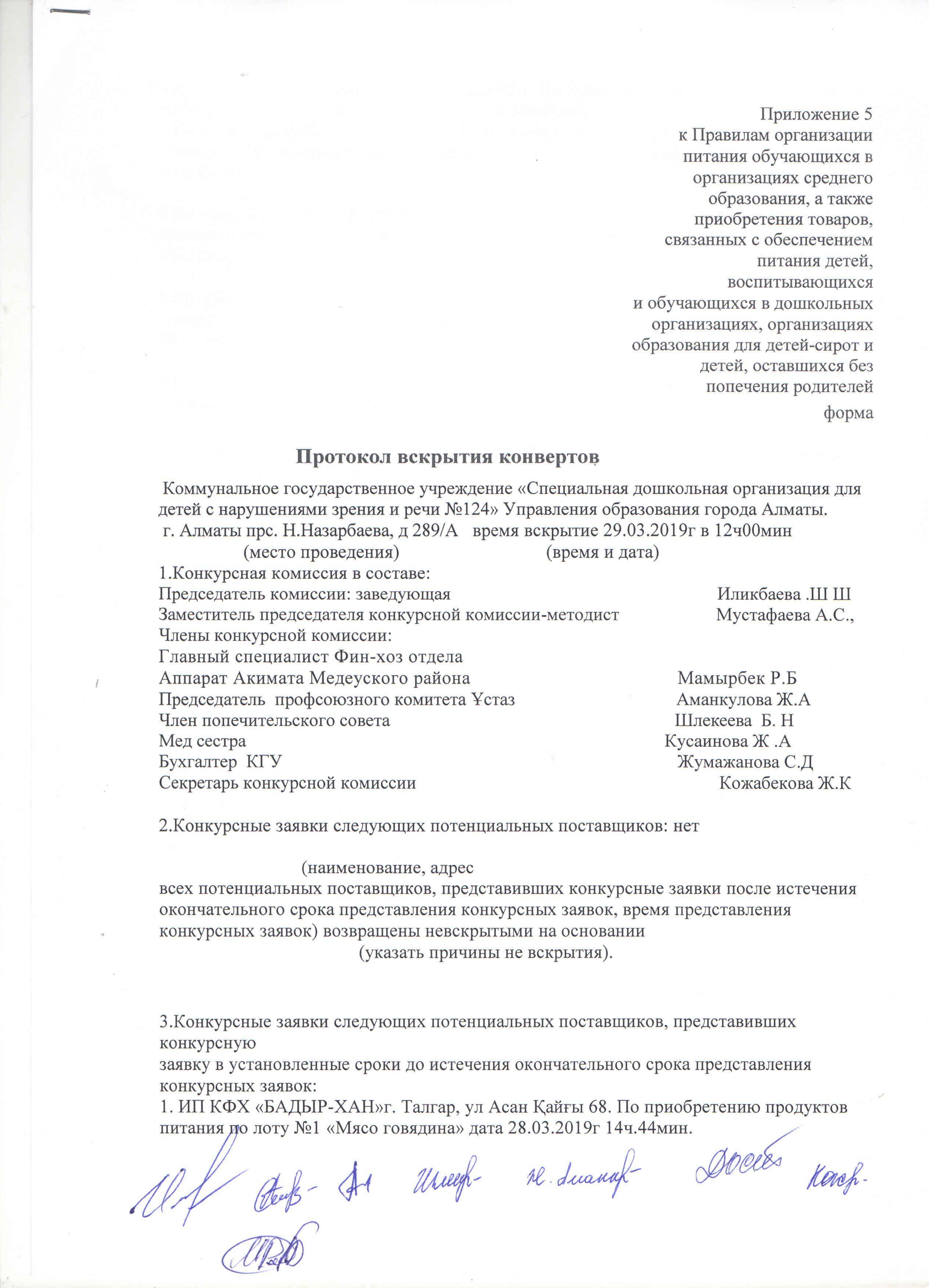 Протокол вскрытия конвертов на 2019 год » ГУ "Специальный (коррекционный) ясли сад №124 для детей с нарушениями зрения"